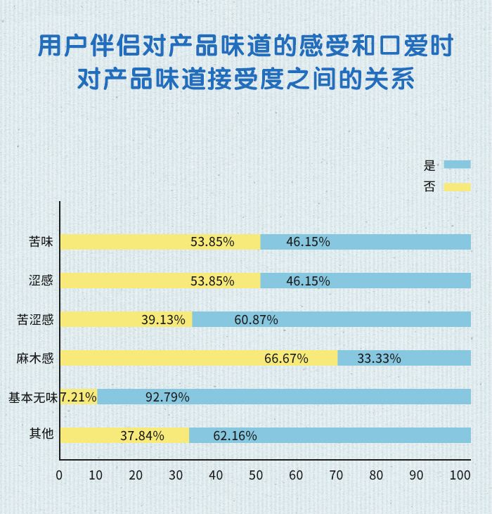 (2)认为产品有麻木感的用户伴侣中,口爱时接受产品味道比例最低(但反馈“麻木感”的总人数较少,所反映的情况可能存在偏差);这说明麻木感可能给伴侣造成更多的心理负担,从而不接受产品。