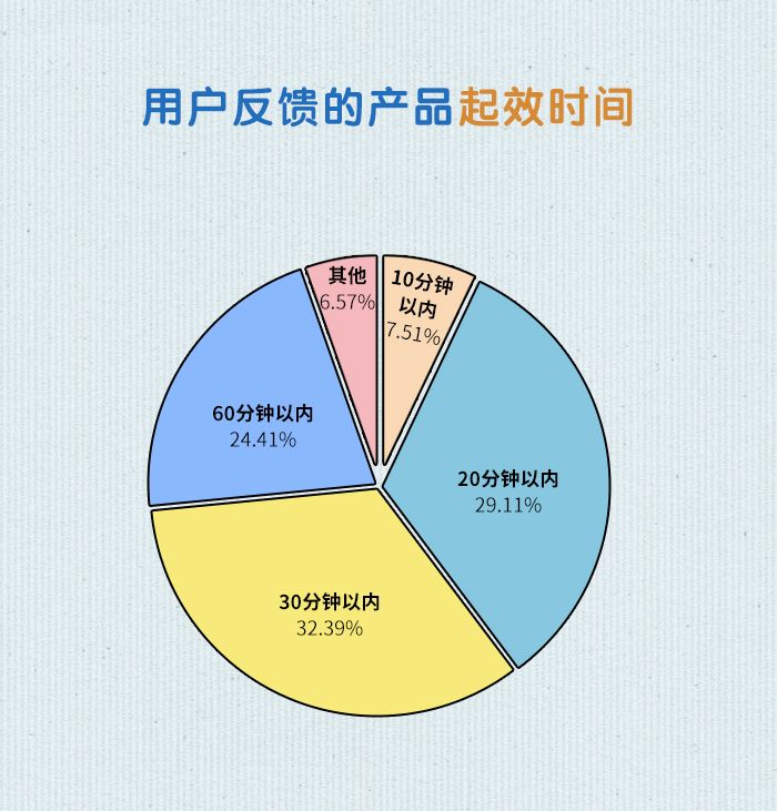 超过6成用户反馈产品在30分钟内**,32.39%的用户反馈产品在30分钟内**,29.11%的用户反馈产品在20分钟内**,7.51%的用户反馈产品在10分钟内**。24.41%的用户反馈产品在60分钟内**,6.57%的用户反馈产品**时间更长或者没有**。