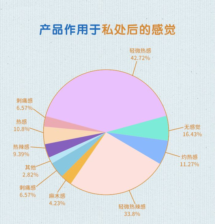 用户对产品作用于私处后的感觉主要是“热”感,反馈有轻微热感的用户比例最多(42.72%)、反馈有轻微热辣感的用户比例为33.8%、反馈灼热感的用户比例为11.27%,反馈热感的用户比例为10.8%,反馈热辣感的用户比例为9.39%。也有少数用户认为产品作用于私处后有凉感(5.16%)、刺痛感(6.57%)、麻木感(4.23%)。16.43%的用户反馈没有什么感觉。
