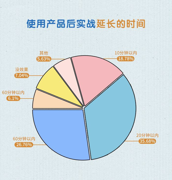 其中原来性爱时间在3-5分钟左右的男性,有68.5%的男性延长到了10-20分钟。可以说这对大部分时间比较短,但也是正常的男性来讲能大大提升作用**。对于3-5分钟左右正常男性来说,该产品的**率达到了96.6%