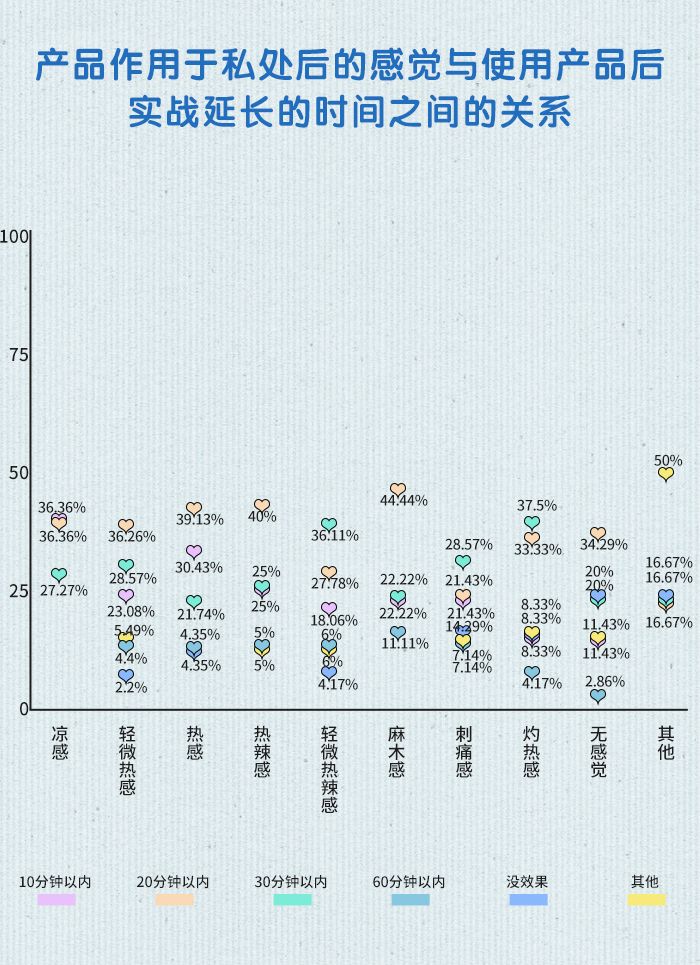 (1)使用产品后,用户实战延长的时间为10分钟内比例最高的是“产品作用于私处后感到轻微热感的用户”;