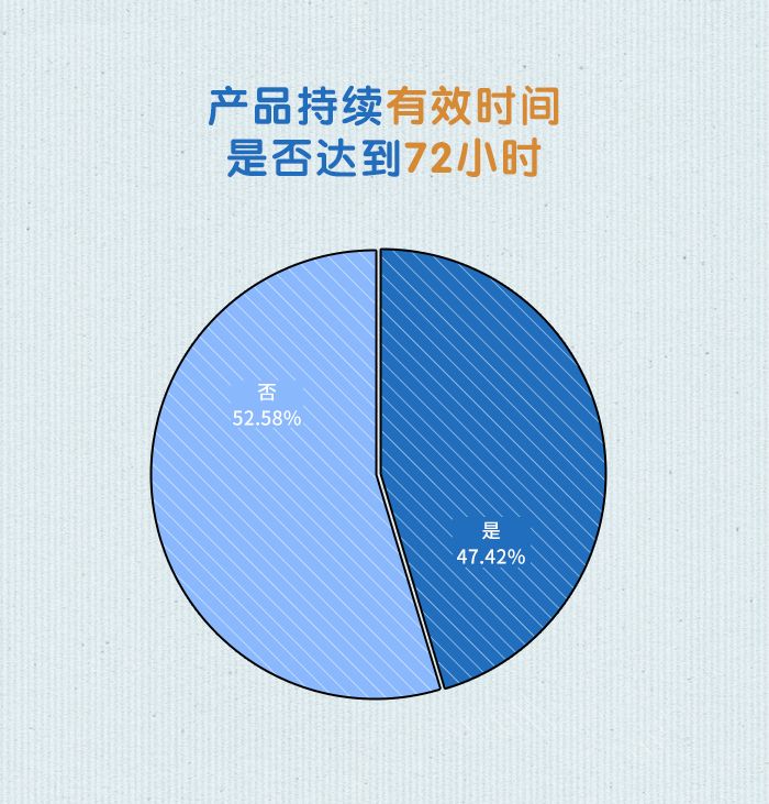 认为产品持续**时间没有达到72小时的用户比认为产品持续**时间达到72小时的用户稍多,分别为52.58%和47.42%。