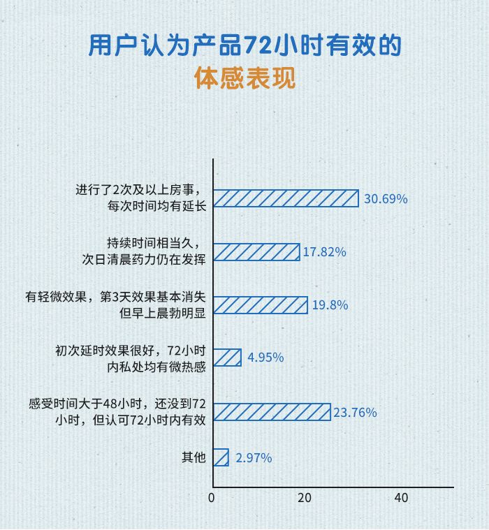 用户认为产品72小时**的体感表现的理由,最多的是“进行了2次及以上房事,每次时间均有延长”,占比为30.69%,其次,有23.76%的用户认为“感受时间大于48小时,还没到72小时,但认可72小时**”。