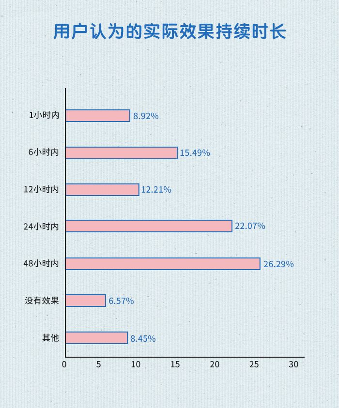 超过50%的用户反馈实际**持续时长在24小时以内,此外,还有26.29%的用户认为实际**持续时长在48小时以内。