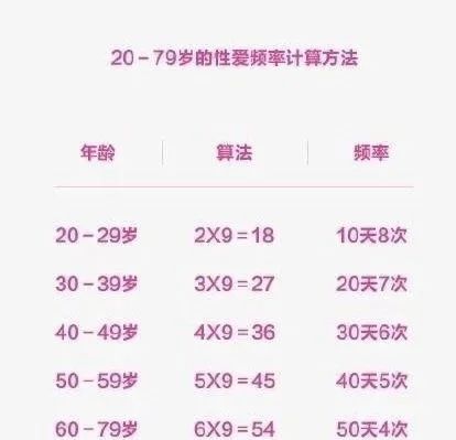 网传美国性学专家认为恰当的性生活频率可遵循一条公式:性爱频率=年龄的首位数×9,如20~29岁的人的性生活频率为18,即10天内有8次性行为,30~39岁的人的性生活频率为27,即20天内有7次性行为。