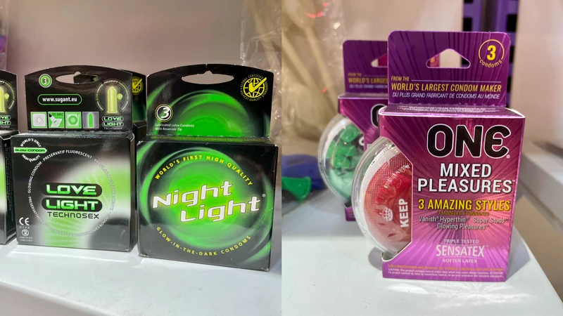 缺少性感元素可能让一些顾客失望,但是这里有很多新款避孕套,各种颜色、香型,还有夜光、冰感、热感、趣味异形套...还有避孕套制作的公仔礼品(类似“填充”毛绒玩具)。