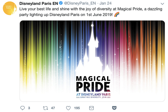 巴黎迪士尼在上个月释出官方消息,将在2019年6月1日,也就是骄傲月的第一天于巴黎迪士尼正式举办“神奇骄傲大游行Magical Pride”。当天,整个迪士尼园区会有许多特别举办的骄傲派对,包括官方举办的神奇游行、独家现场音乐会、主题式摄影等,共同以彩虹色彩挥洒迪士尼童话王国。