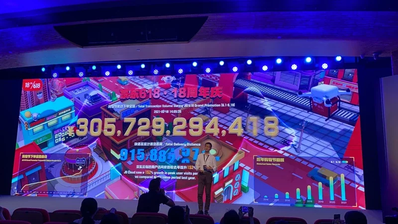 2021“京东618”18周年庆新闻记者会今在京东总部举行。截至18日下午14时04分,“京东618”累计下单金额已达3056亿元人民币,数据仍在攀升中。