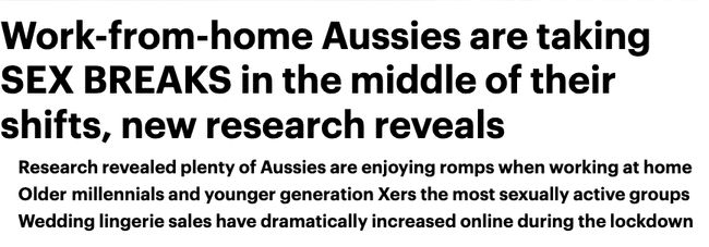 根据一项新的研究,越来越多的澳大利亚人在家工作时利用午间时间进行性行为。