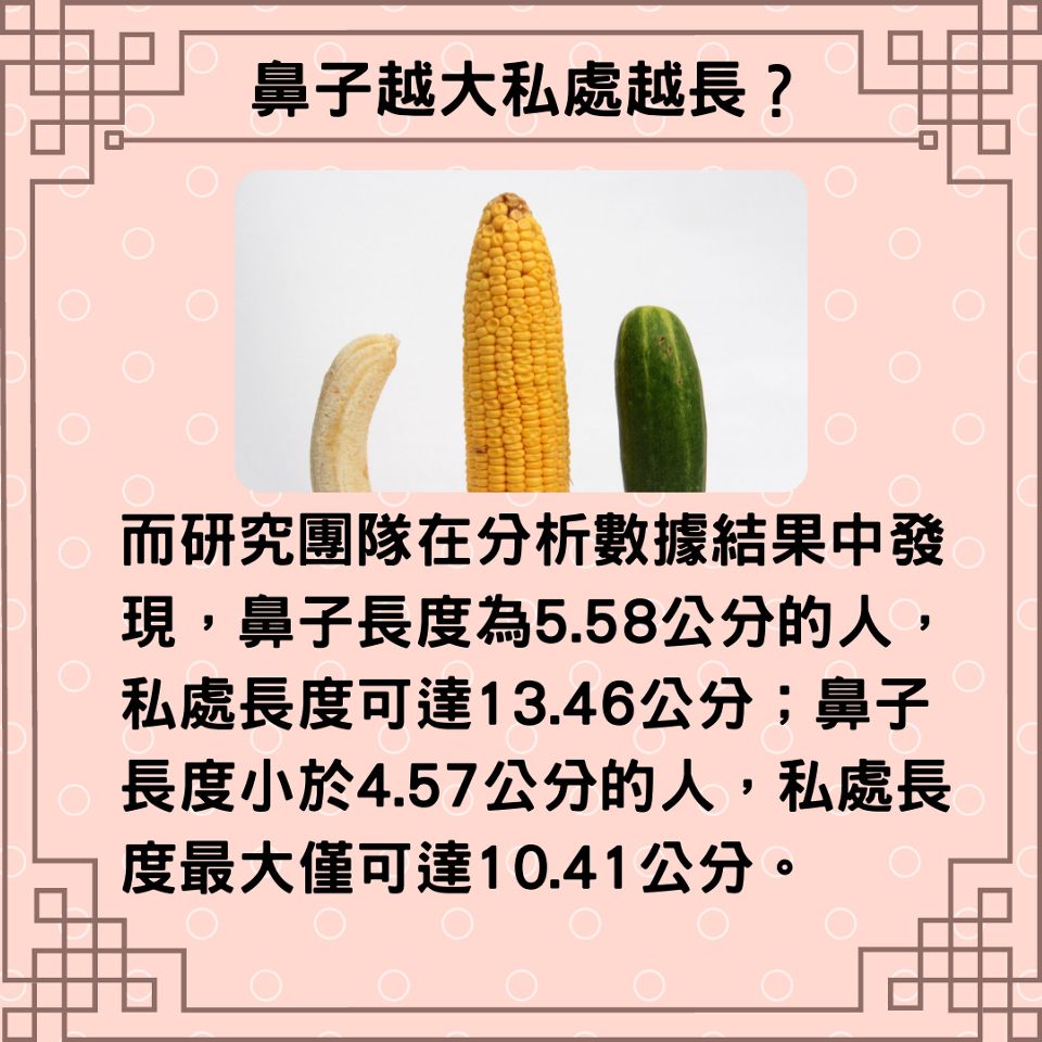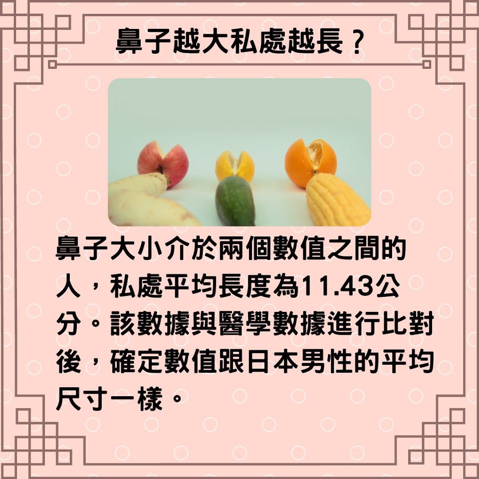 而研究团队在分析数据结果中发现,鼻子长度为5.58公分的人,私处长度可达13.46公分;鼻子长度小于4.57公分的人,私处长度最大仅可达10.41公分;鼻子大小介于两个数值之间的人,私处平均长度为11.43公分。该数据与医学数据进行比对后,确定数值跟日本男性的平均尺寸一样。