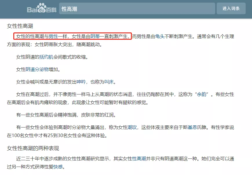 百度词条:「性糕潮」,关于女性性糕潮的定义提到,女性的性糕潮是由因蒂一直刺激产生。