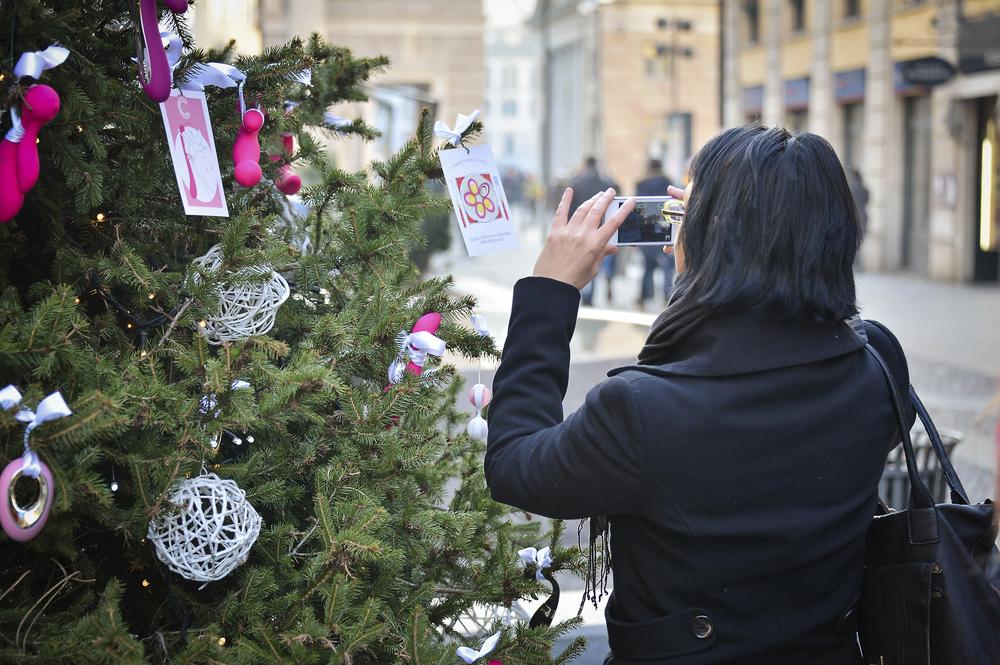 一位女士在情趣用品圣诞树前拍照