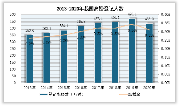我国离婚对数和离婚率也在长期持续攀升。2013-2020年,我国离婚登记对数攀升至400多万对。