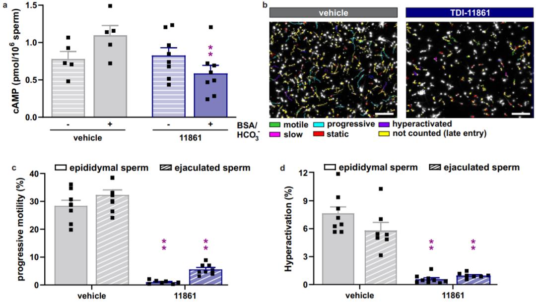 该研究显示单剂量的安全,急性作用的sAC抑制剂与长停留时间使雄性小鼠暂时不孕。老鼠表现出正常的交配行为,并在第二天恢复完全的生育能力(在小鼠模型中,sAC 抑制剂TDI-11861使用后 2 小时可以 100% 有效避孕,3 小时后,一些精子开始恢复活力,到了 24 小时,几乎所有的精子都恢复了正常的运动,生育能力完全恢复)。这些研究将sAC抑制剂定义为男性按需避孕的先导,并为以前未经测试的避孕范式提供了体内概念验证;男性单次服用后按需避孕和药理学避孕。