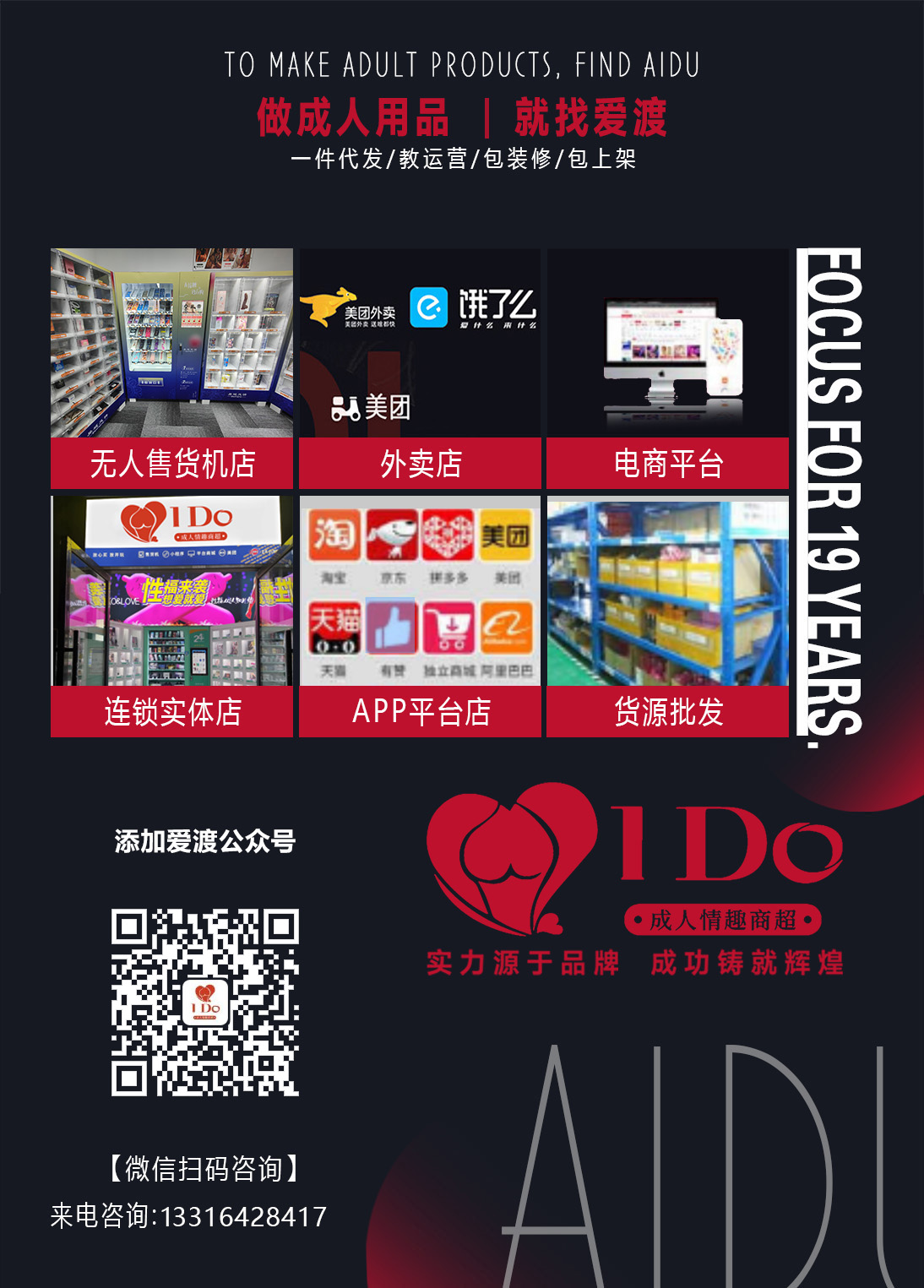 深圳市爱渡投资发展有限公司(简称“爱渡”),微信复制 idoaidu168 加微信咨询主要针对B端用户群体,主营业务线是对外通过供应链、及技术性、和运营性的服务,来实现业绩增长。具体是针对合作商提供线上:淘宝、拼多多、京东、天猫、阿里等电商平台、线下:美团、无人售货店、无人仓店等渠道,提供:低供货价的货源、技术性的服务、和运营性服务,包括但不限于:开店、装修、上架、美工、店铺定位、产品定位、选品、店内活动、产品活动等