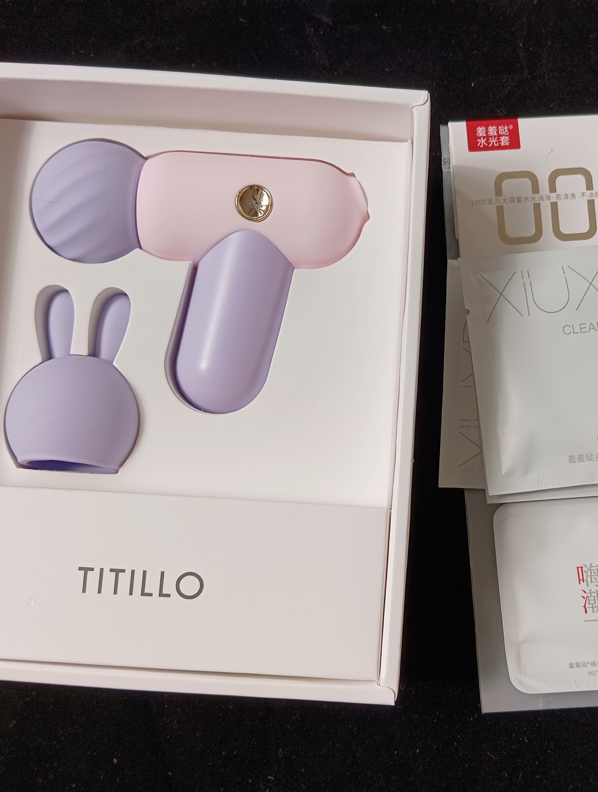 有两个可替换的头套 一个螺纹原装的一个兔耳的 各人觉得用原装的马力比较足 并且能够无死角覆盖 但是换上兔兔头套又能体验不一样的感觉 精准夹击