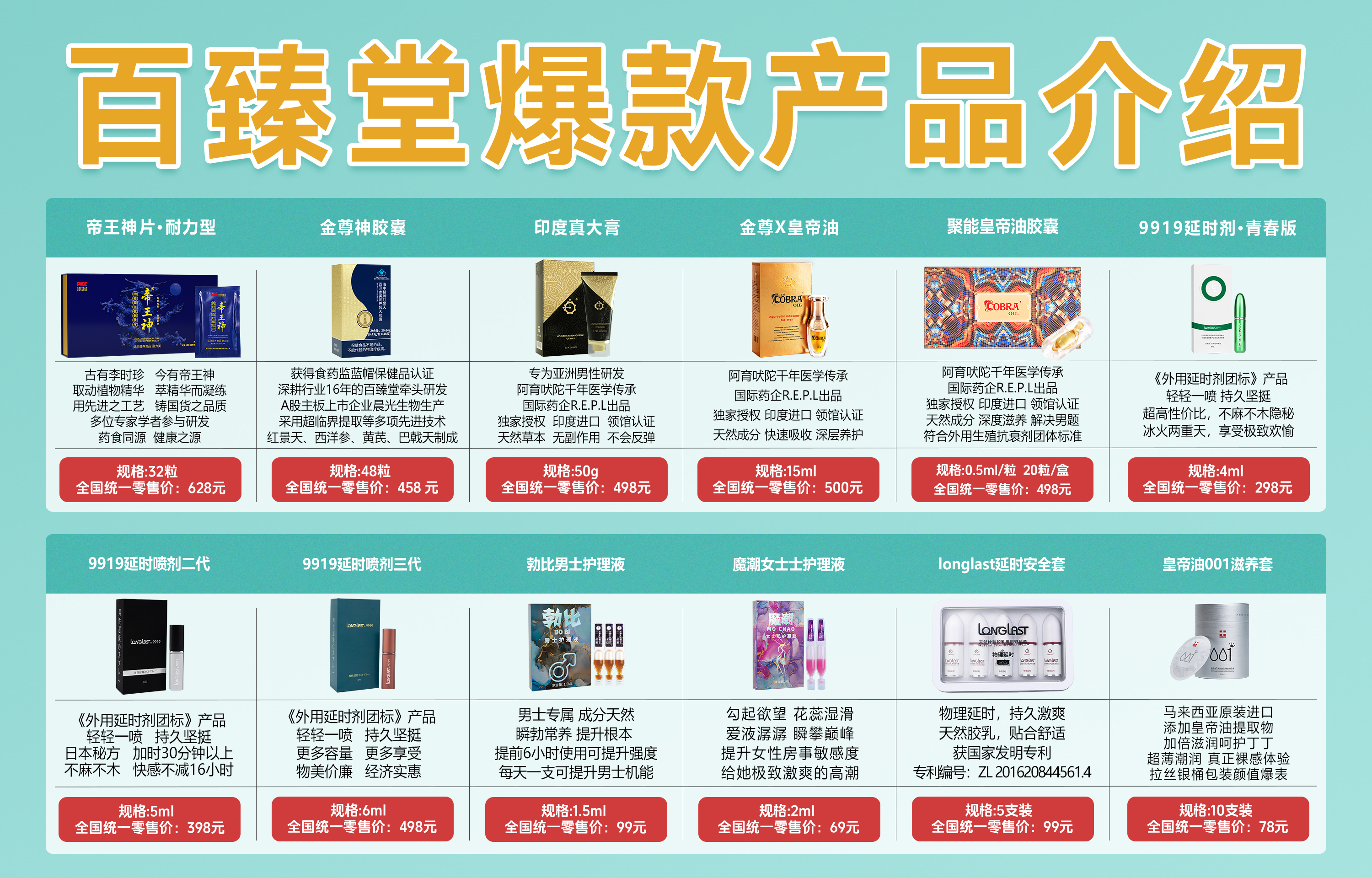 第二:我们百臻堂外用修护系列,咱们百臻堂外用修护系列有印度进口真大膏,聚能皇帝油,助勃液,新人刚开始做,不建议推的太多,可以选择咱们印度进口真大膏和聚能皇帝油。聚能皇帝油是世界驰名的产品,很多客户听过印度神油的名字,在我们做销售的时候就容易推单,印度进口真大膏对于一些年轻人想快速吸收的客户可以推印度真大膏,因为真大膏有三秒渗透,五秒吸收的效果,所以很多年轻人喜欢。而聚能皇帝油比较全面,有阴囊潮湿,前列腺炎,年龄大一点的客户用油的效果就比较好。另外客户可以搭配使用,两款产品搭配用效果更好。
