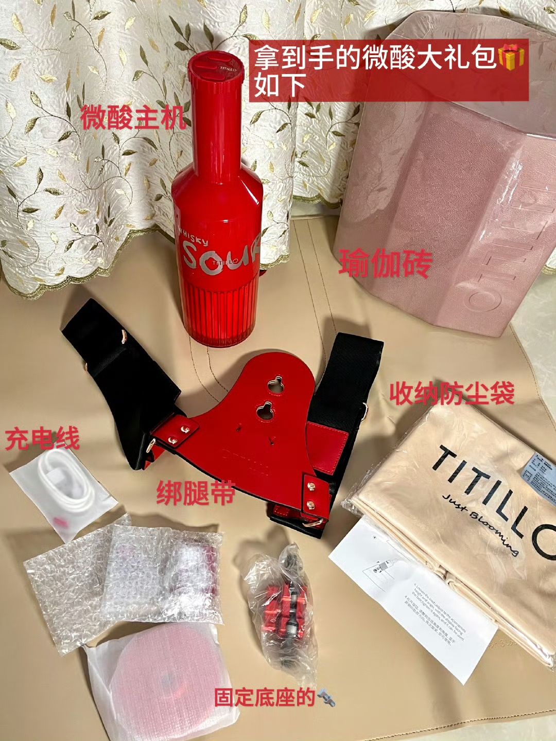 🎁拿到手🈶:主机,瓶盖遥控器,充电器,固定螺丝🔩,绑腿带,瑜伽砖,收纳袋,专用皮垫,说明书🤔