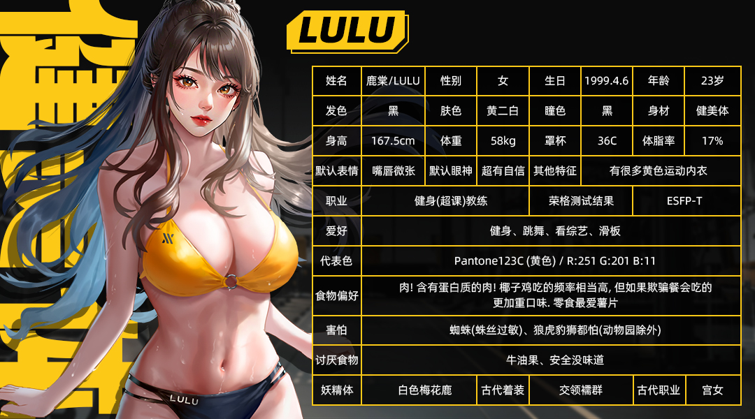 鹿棠,英文名lulu,原是妖界灵兽之一,后因勤力修炼,得遇仙界七仙女之首绛红开化,收为座骑,一跃成为仙界神兽。棠鹿与琴原皆为绛红所爱,可惜因为琴被扔下仙界不知所踪,棠鹿放心不下,欲前往三界寻找。绛红也因一时之气扔了琴而自责,便允了棠鹿自请去往三界寻找相伴千年的好友琴。于是,棠鹿在人界化名lulu,因擅奔袭,身姿娇健,她便重操旧业,成为了一名运动健身教练,她一边在人界四处打探琴的下落,一边向所有女孩传播爱人先爱己,爱己而后爱人的悦己理念,鹿棠蓬勃向上又极度松驰的状态吸引了很多爱慕者和追随者……