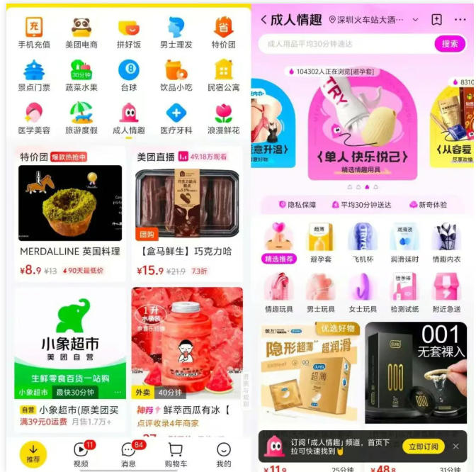 近期,美团开始测试一个名为“成人情趣”的一级入口,给予了较高的流量位置;用户可线上下单玩具、内衣等各类情趣用品,和外卖一样享受30分钟内送达。