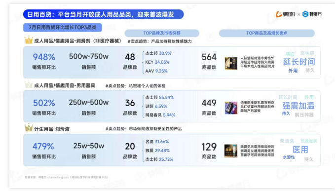 “蝉魔方”数据显示,2024年上半年,抖音平台成人用品/情趣用品类目销售额超过2500万元,增速超过1330%,远高于抖音电商整体增速。