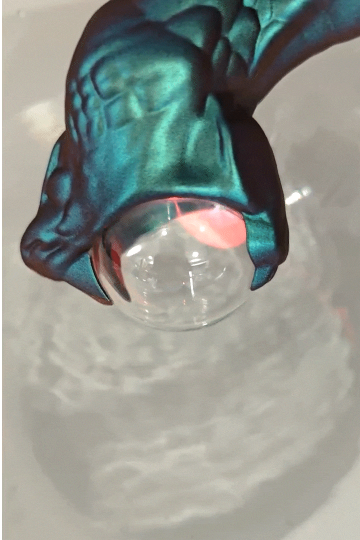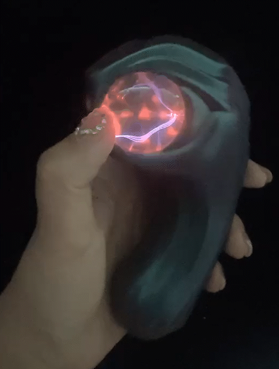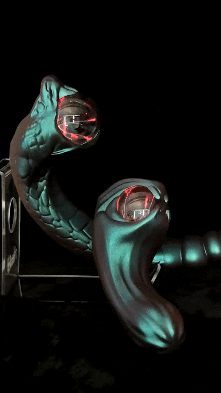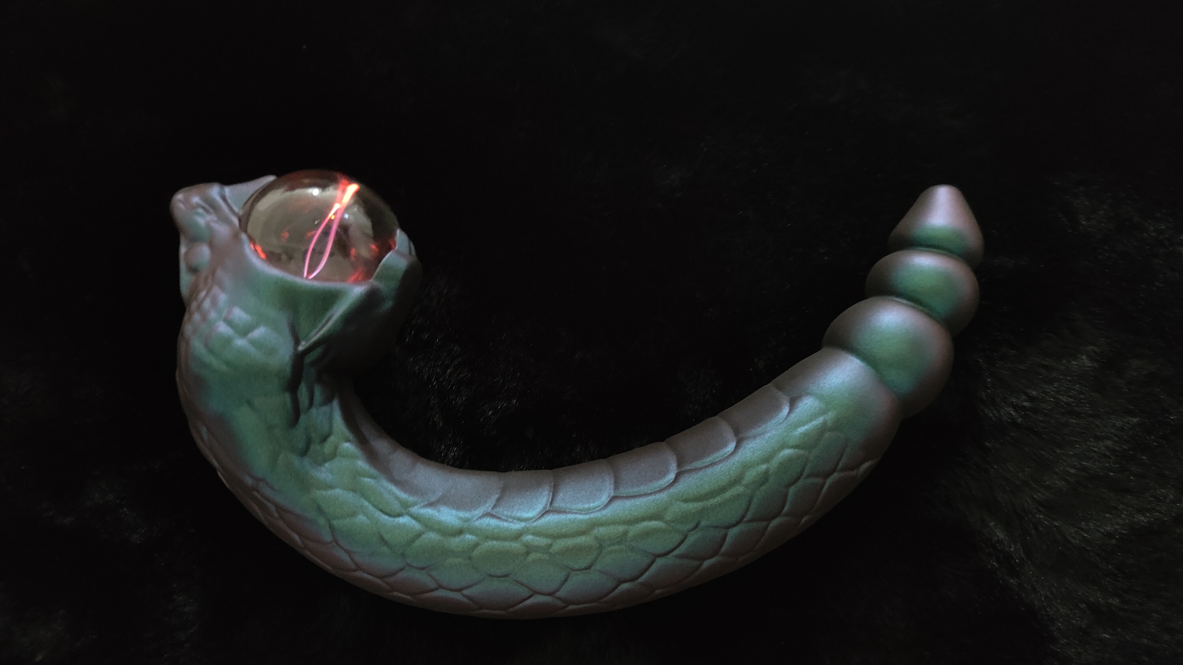 蛇口中的透明球体实则是一枚静电离子球,在漆黑的环境中,流动的红色光电在球体内闪烁,如同蛇口中喷出的闪电,视觉**震撼。