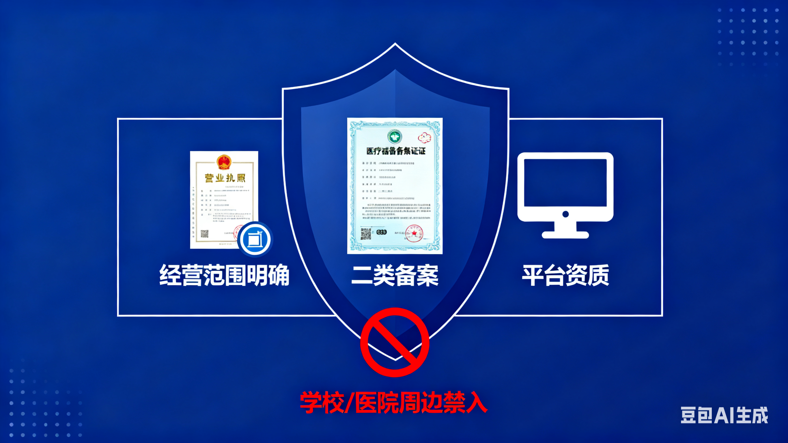 - 特殊资质:卖避孕套等需《二类医疗器械经营备案凭证》,治疗类器具需《医疗器械经营许可证》。