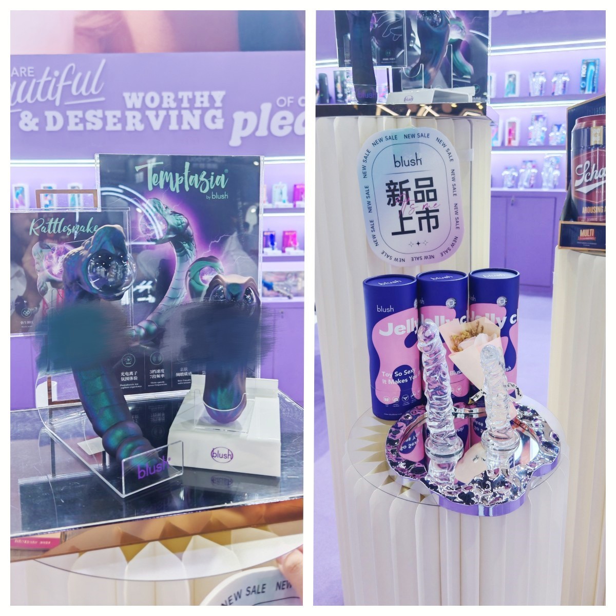 在Blush展位中,重点展示了旗下Blush系列、Play With Me系列、Temptasia系列、健康系列等众多在全世界范围内广受产品线,值得瞩目的是——透明**产品线Sweet Me系列重磅登场。
