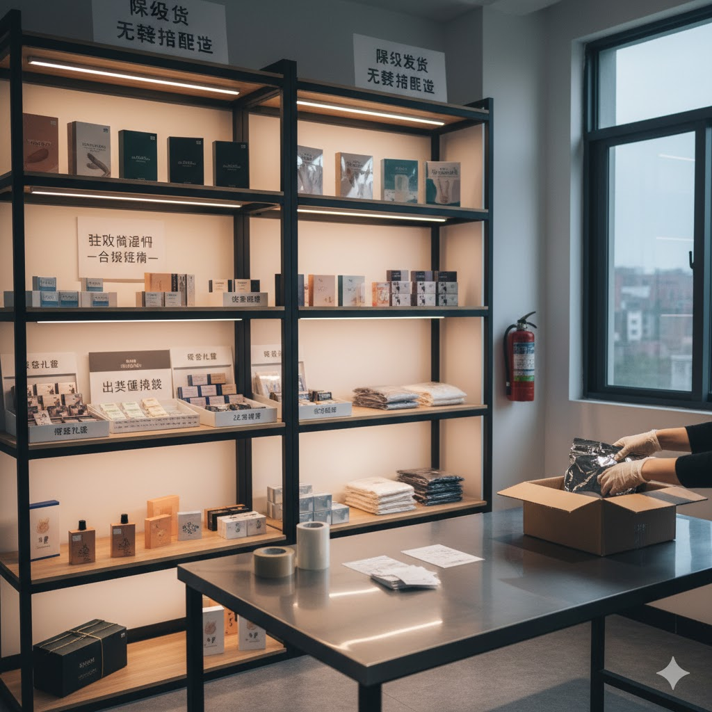 三层保密:铝膜袋 + 中性纸箱 + 无标识胶带。
