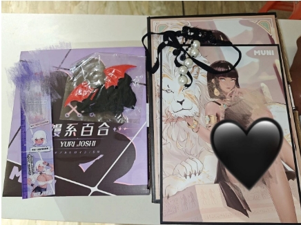 月下:字母卡是u,彩盒封面是月下和白羽相拥的身材阴影感设计,侧边两面分别是月下和白羽的人物图展现,整体色彩饱和度比较高,非常有质感的一款彩盒
