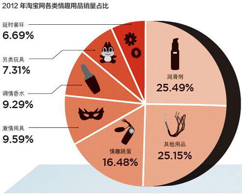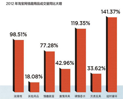 事实上,近年来,情趣用品的网络购买增长呈现加速度趋势。阿里巴巴向《21CBR》提供的数据显示,2012年情趣用品(剔除避孕套等计生用品)的成交额同比增幅高达59.7%,购买人数同比增加62%。