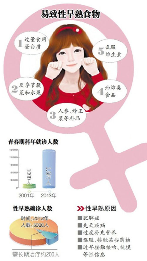 “以往性早熟患者是因器质性病变,或者误服、接触某些药物而造成。现在,过半的性早熟患者发病原因都与过度补充营养有关,实际上这类性早熟是完全可以避免的。”于泓说。