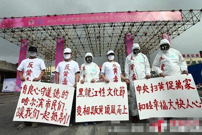 6月27日,哈尔滨市国家冰上训练基地“黑龙江首届国际生殖健康与人文艺术博览会”会展外,六名市民上演对台大戏,他们头戴防毒面具,举牌呼吁抵制此次性文化节的色情毒害及污染。