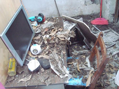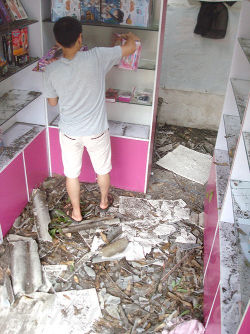随着“哗啦”一声,店门被打开,里面的情景与光鲜清爽的门头装潢形成强烈反差。记者看到,10来平方米大小的店面已成了一片“废墟”:地面堆满破碎的瓦砾和杂物;简单的货柜上摆放着一排排五颜六色的性用品,上面同样落满了灰尘;房顶的石棉瓦露出3个大洞,整个吊顶仅剩下四五块白板耷拉在货柜上方。