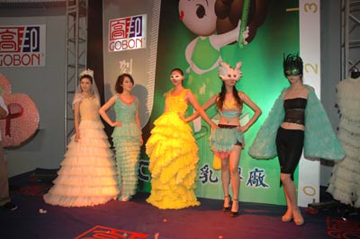 在昨天开始的第四届计划生育生殖健康新产品新技术博览会上,几十套用安全套做成的漂亮浪漫的婚礼服、比基尼、代表中国传统的婀娜多姿的旗袍、现代派的比基尼、草裙装等各式时装在模特的倾情演绎下显得漂亮异常,让在场观众为之惊叹。展示的时装大部分都是由安全套厂商桂林高邦公司的员工利用业余时间亲手制作,另一部分时装是一些京城服装设计师在获悉该企业的壮举后,为提高作品的艺术含量,亲自制作的精美服饰。据悉,迄今为止,如此大规模的安全套时装秀在国内还属首次。