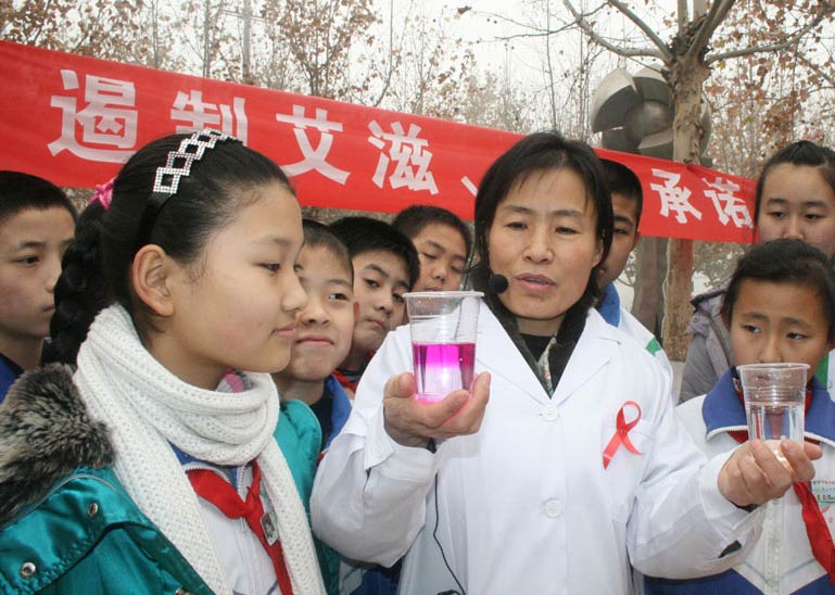 11月30日,山东博兴县实验小学开展“艾滋病预防知识进校园”活动,邀请县疾病预防控制中心的医务人员走进校园,组织部分小学生集体做起一场别开生面的“游戏”——模拟艾滋病传染过程的“换水游戏”,通过做这种“游戏”,形象地向小学生宣传有关艾滋病的危害性以及预防艾滋病的相关知识,让他们正确认识艾滋病,提高防范艾滋病意识。