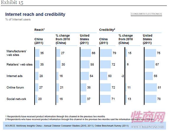 麦肯锡表示,在中国,只有20%的互联网用户会使用社交媒体与其他用户分享产品信息,而美国的这个比例达37%。不过,鉴于社交媒体用户越来越愿意相信其他人提供的信息,中国的这个比例无疑还会提高。