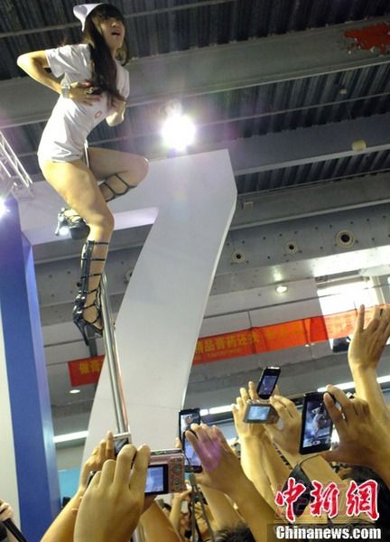 当模特身穿内衣走秀时,T台被围得水泄不通,有相机的举相机,没相机的举手机。商家为了吸引眼球,也在自己的展台前找了模特作秀。在内衣秀的T台对面,一商家让一名美女模特表演钢管舞。当这名身穿黑丝内衣的模特在3米多高的钢管上表演各种高难动作时,现场不少人惊呼热辣。今年才出现的“中华旗袍秀”,也吸引了不少观众围观。