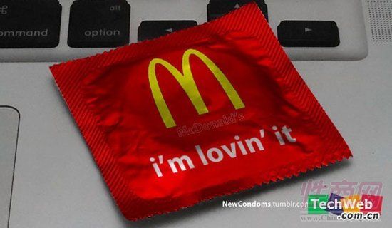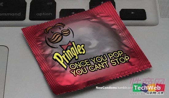 马克思收集了诸如品客薯片,耐克或麦当劳这样的知名品牌的商标,接着,将他们印到避孕套的包装上。这样一来,品客那著名的标语“Once you pop, you can’t stop(原意为:一旦开始吃品客薯片,你就欲罢不能。)”获得了全新的内涵(你懂的) 。
