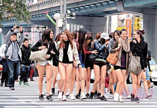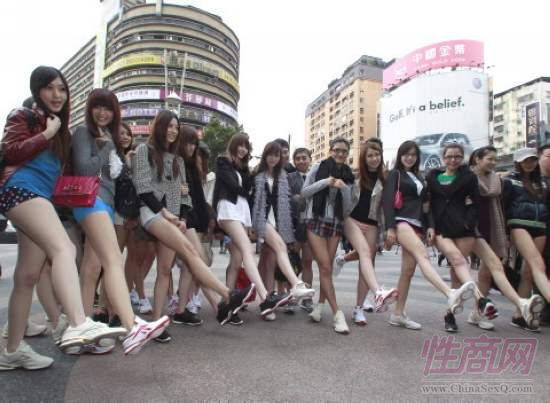 环球网报道 2012年2月15日,少女们走在台北东区街头模仿海外“无裤日”活动,成功吸引众人目光。当日,台湾地区20名身材火辣的“正妹”下半身只穿内裤搭乘台北捷运板南线,大方裸露修长美腿,引起了车内男乘客的骚动。