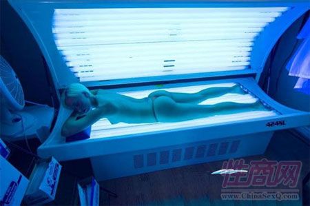 女孩在用紫外线灯晒黑肤色
