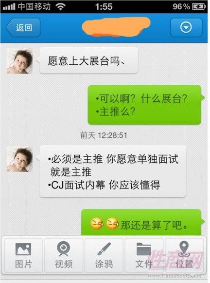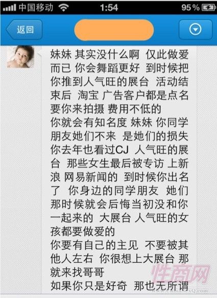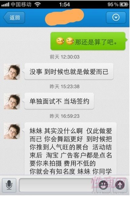 在该ShowGirl展示的聊天记录里,这位匿名人士称,如果想要主推上大展台,就必须单独面试,到时候也就是做爱而已,单独面试不当场签约,如果愿意,可以推到人气旺的展台。活动结束后,淘宝、广告客户都会点名来拍摄,费用不低。去年CJ人气旺的展台,那些女生最后都被专访,大展台、人气旺的女孩都要做爱。