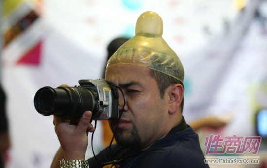 2011年3月3日,墨西哥墨西哥城,一名男子头戴安全套造型的帽子,在性文化博览会上拍照。