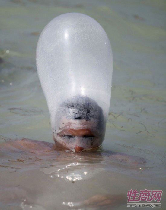 2010年8月6日,古巴Jibacoa海滩,Rotilla电子音乐节上,一名男子戴着安全套在水中游泳。