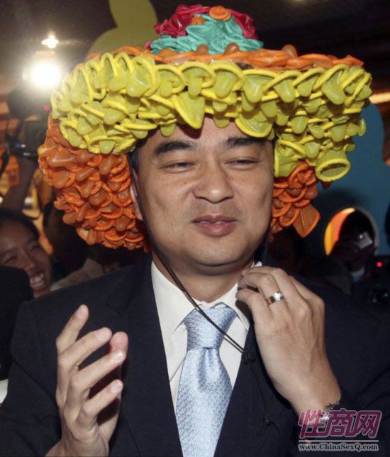 2010年11月25日,泰国曼谷,泰国前总理阿披实头戴安全套帽子,参加抗艾宣传活动。