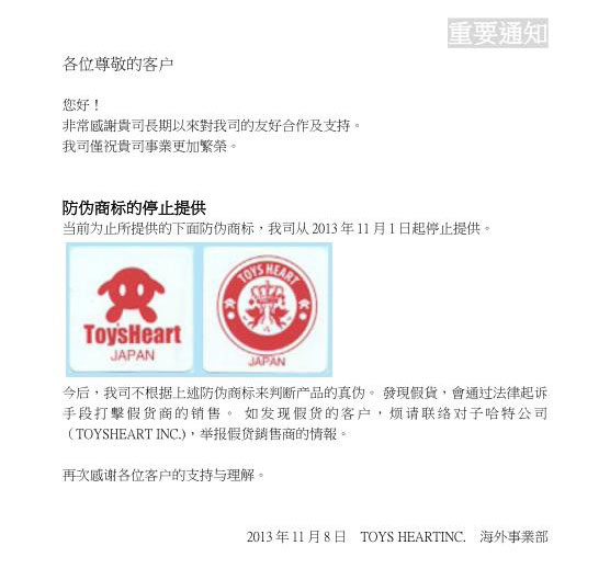 日本著名企业对子哈特从2013年11月1日起停止提供防伪商标。