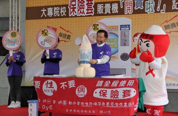 据台湾媒体报道,由于艾滋有年轻化趋势,各地政府加强倡导,17日上午,台中市卫生局在弘光科技大学举办“中市校园保险套贩卖机开卖啦”记者会,由副市长蔡炳坤担任艾滋病防治大使,亲自教学生如何正确使用保险套。