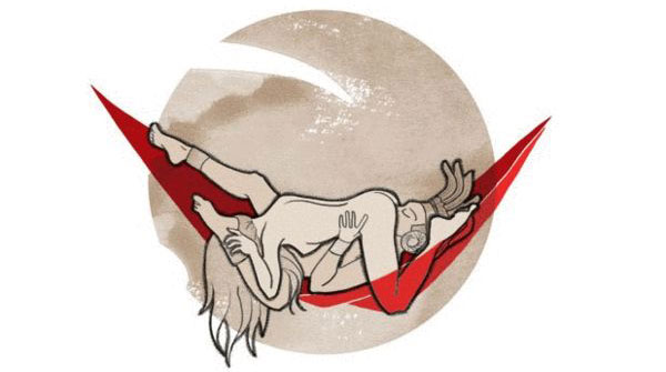 男伴倚着吊床而坐,身后垫一个厚实的靠枕;两腿弯曲竖起,双手环抱住心爱的女子。女性可以把双腿架在爱人的肩上,面对面地坐着。男性要控制好速度,女性身体微微后仰,双手张开更容易达到HIGH 点。在不平衡的状态下,这就像是自始至终摇摆的游戏。