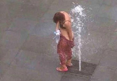2013年8月12日,有网友在北京建外SOHO广场喷泉拍到一位搓澡大妈!大妈,上身穿内衣,下身裹裙子,还备了搓澡工具,被拍到时,头发已经洗净。不少网友感叹,喷泉搓澡,省水省钱,这也算是一个生活技能吧,牛逼的中国大妈,不只会炒黄金,还能喷泉搓澡省水省钱。