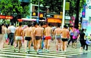 因市民举报每到下午5时许,佛山市禅城区祖庙附近就会出现一群裸奔的人,他们全身只穿一条四角内裤,嘴里还喊着“完成任务”的口号。2013年7月28日,记者亲眼看到这群裸奔的人。一裸奔男子告诉记者,他们都是一家健身俱乐部的业务员,因完不成当天任务而遭到惩罚。
